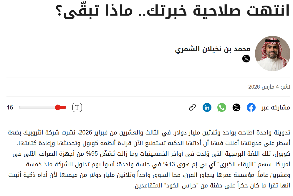 تدوينة واحدة أطاحت بواحد وثلاثين مليار دولار. في الثالث والعشرين من فبراير 2026، نشرت شركة أنثروبيك بضعة أسطر على مدونتها أعلنت فيها أن أداتها الذكية تستطيع الآن قراءة أنظمة كوبول وتحديثها وإعادة كتابتها. كوبول، تلك اللغة البرمجية التي وُلدت في أواخر الخمسينيات وما زالت تُشغّل 95% من أجهزة الصراف الآلي في أمريكا. سهم "الزرقاء الكبرى" آي بي إم هوى 13% في جلسة واحدة؛ أسوأ يوم تداول للشركة منذ خمسة وعشرين عاماً. مؤسسة عمرها يتجاوز القرن، محا السوق واحداً وثلاثين مليار دولار من قيمتها لأن أداة ذكية أثبتت أنها تقرأ ما كان حكراً على حفنة من "حراس الكود" المتقاعدين. |