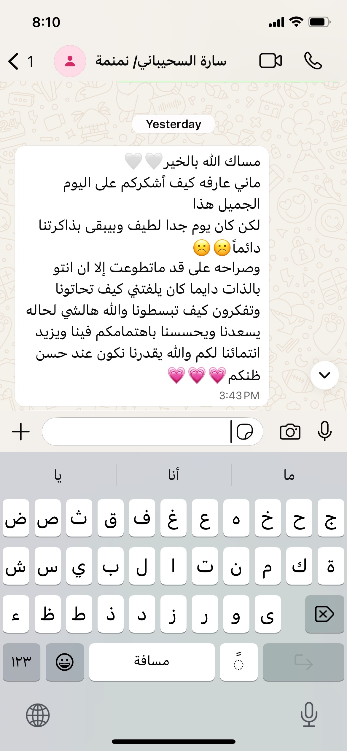 اختُتمت رحلة برنامج نمنمة بلقاء ودي دافئ جمع المتطوعات في أجواء صباحية جميلة، وبعد اللقاء، طلبنا من بعضهن أن يصفن التجربة بكلمات تعبّر عن أثرها في نفوسهن. فجاءت رسالة مسؤولة التطوع شهد المطرودي تقول: |