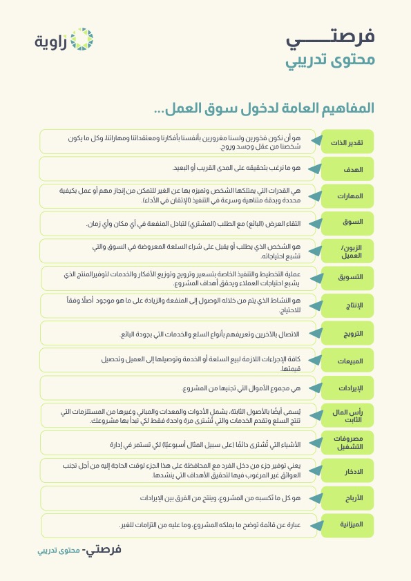 من أهم الخطوات الأولى لنجاحك هي التعرف على المفاهيم العامة لسوق العمل ل تتمكن من إدارة مشروعك بثقة. |