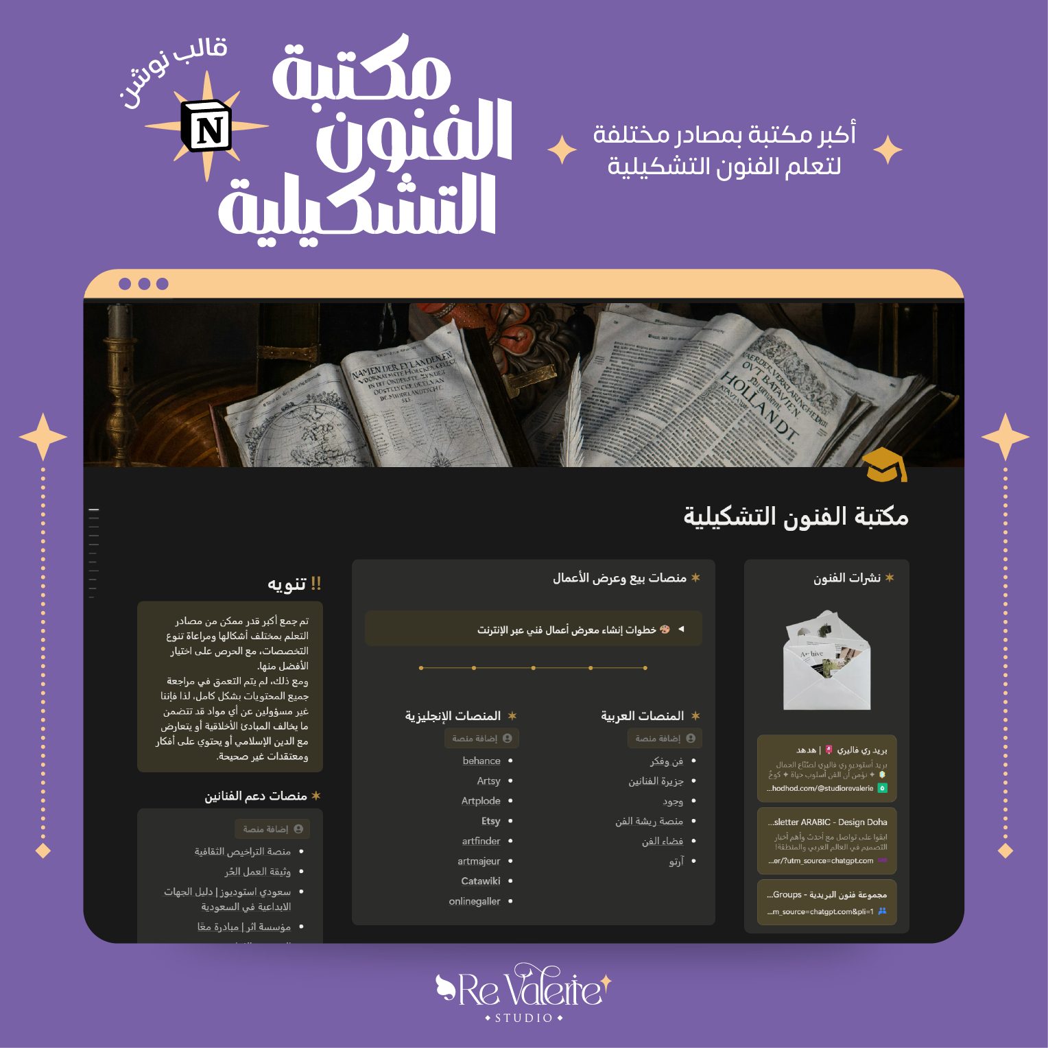 هذه المكتبة قمت بتوفير كل ما تتصوره عن الفنون في البداية قمت بضم مايوفق 30 نوع من الفنون منها الحِرف اليدوية لكن وجدت انه يسبب تشتت أكثر لمن لا يُحب ممارسة العديد من الفنون لذلك لا تقلقوا أعمل بجهد لتقسيم وتوفير منظمات ملائمة مع كل نوع منها لكن الأن تركيزي على الفنان بشكل عام والتشكيلي بشكل خاص 🖌️ والامر الجيد اذا لم تكن تحتاج إلى منظم للحياة فقد قمت بتوفيره بشكل منفصل