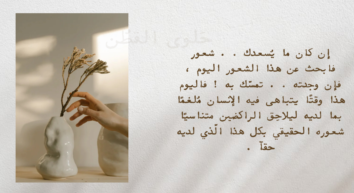 أنت هو الشعور ، أنت هو الأساس ، أنت الّذي يصدّق ويؤمن ويعلَم إن كُنت تستحق لحظاتٍ سعيدة تكتبها في قائمتك لتراها كلما أخذ إعصار العالم المتسارع من هدوئك وجمال روحك وسلامتها وسكينتها . |